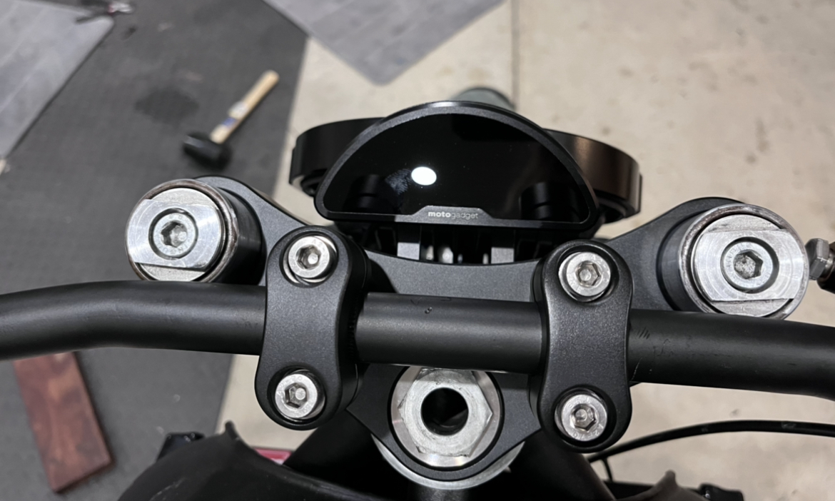The “Scram” Triple Tree Clamp has four Ø8mm and two Ø10mm holes to be used with most aftermarket risers, including our own Rebelmoto risers, which of course are specially designed for our triple trees. The Rebelmoto risers are mounted by a single M10 bolt and the extra Ø8mm holes can be used to channel any wires from inside the bars out through the bottom of the Triple Tree Clamp.