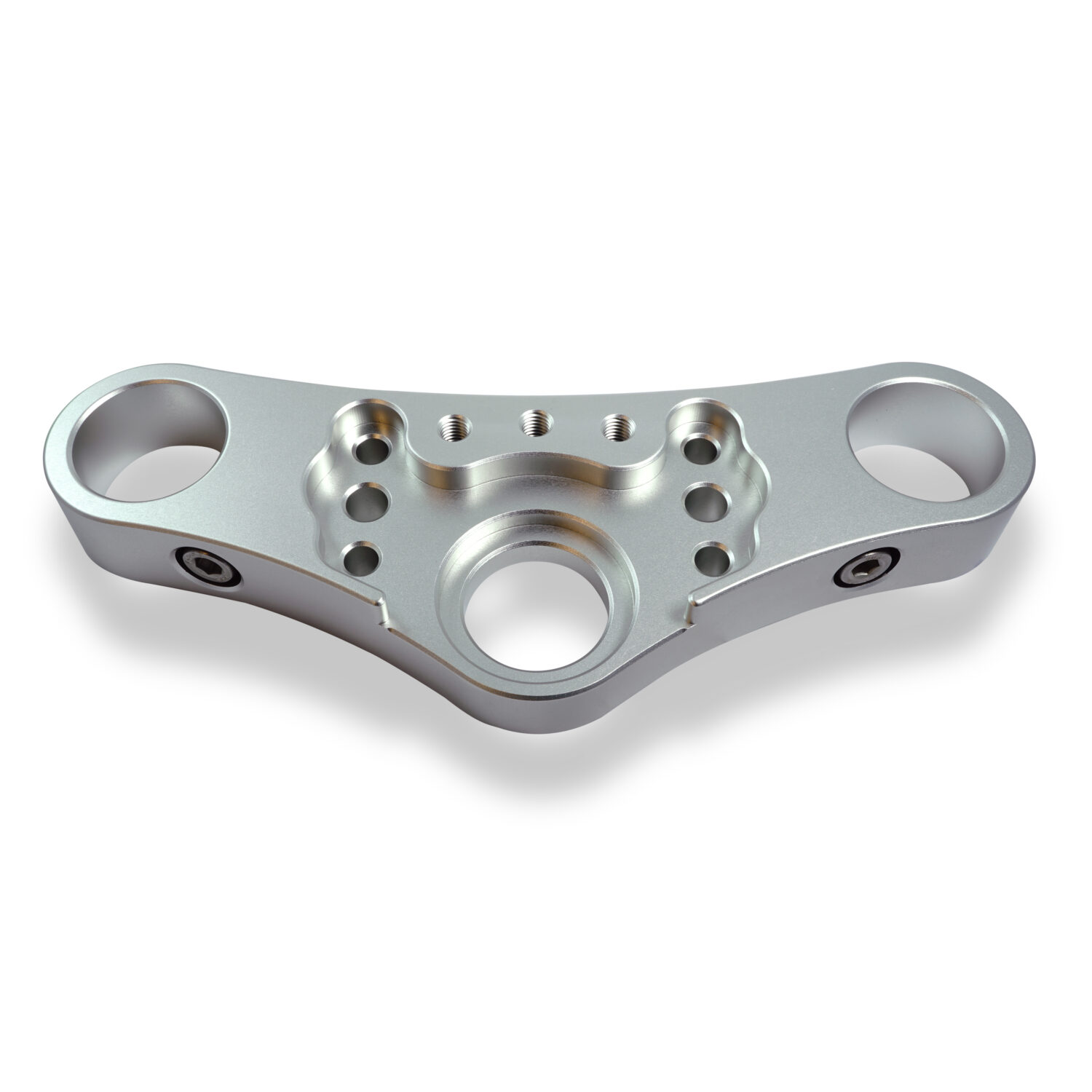 This high quality triple tree clamp is CNC machined out of a single piece of aircraft grade aluminium. After machining the triple tree clamp undergoes a series of surface treatment steps including anodizing. The result is a smooth satin finish that is both scratch and weather resistant. Perfect for a scrambler motorcycle build or any other custom build, where you wish to use bars.
