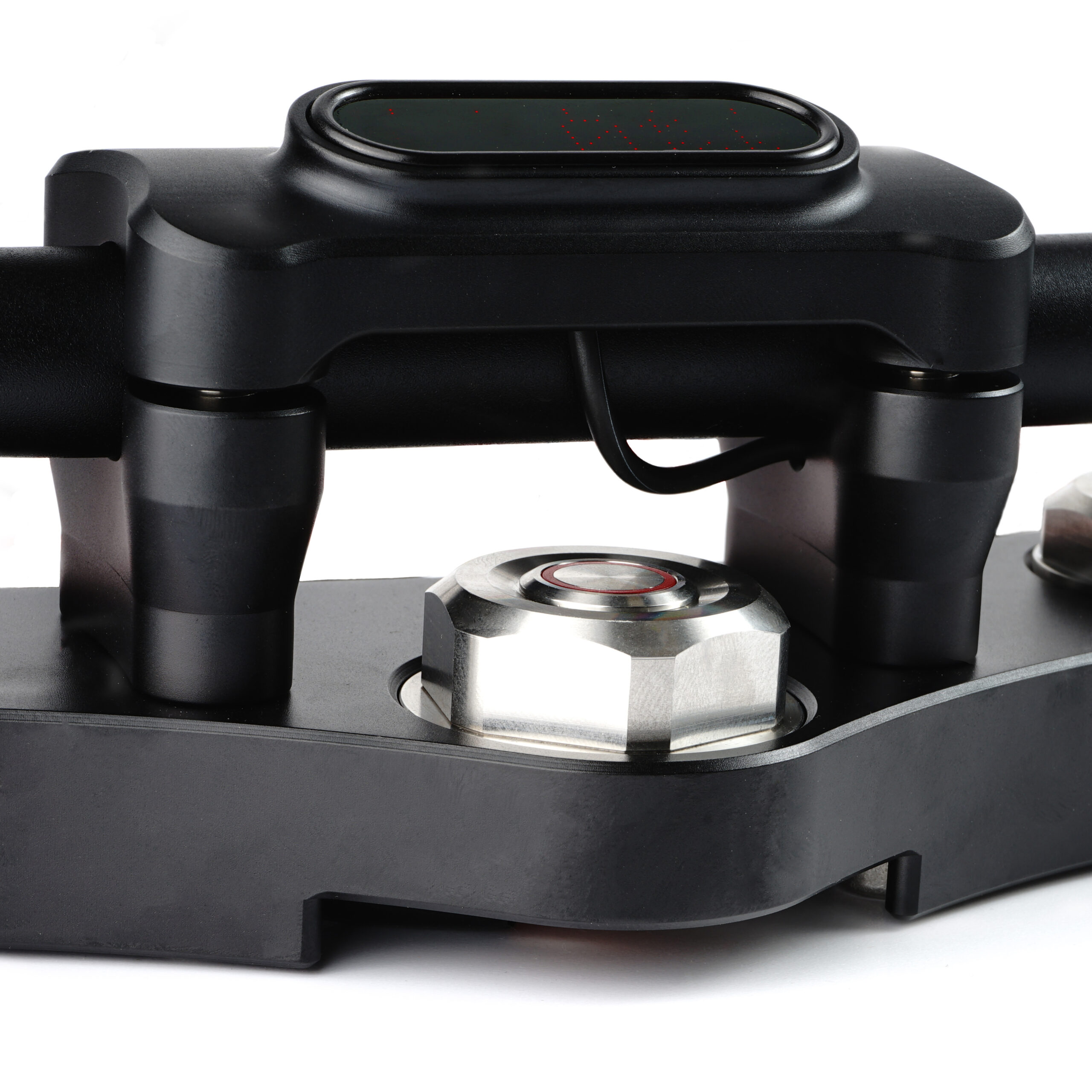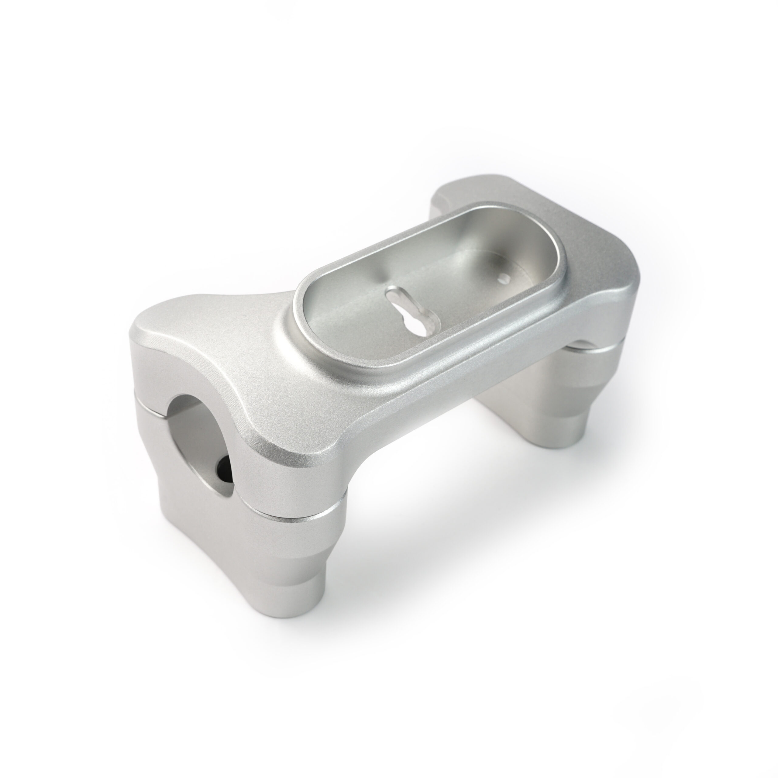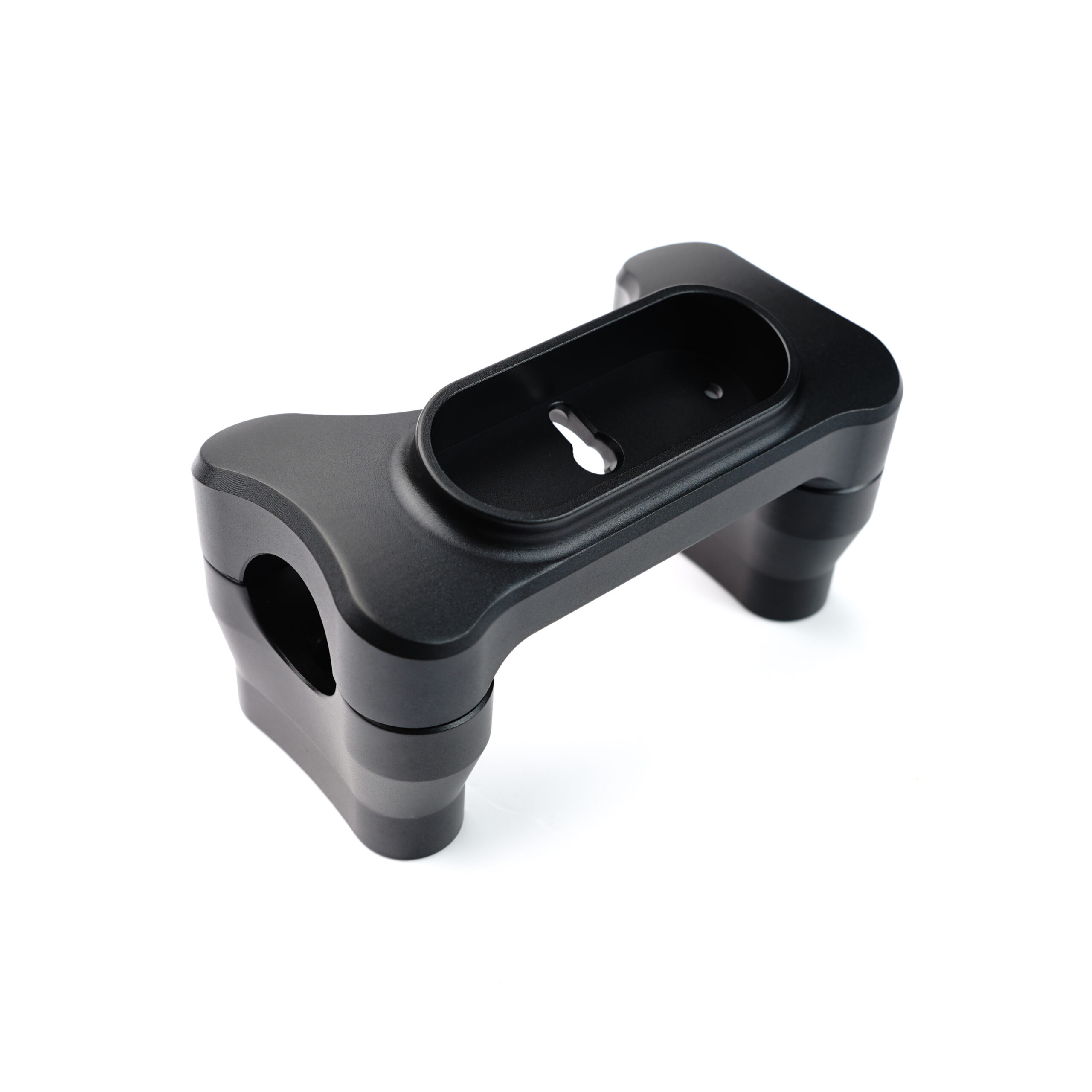 The risers bracket has been CNC machined out of three pieces of aluminium. After machining the parts undergo a series of surface treatment steps, including anodizing. The result is a smooth satin finish, that is both scratch and weather resistant. Available in both black and silver anodized, which matches the black and polished versions of the Motoscope Mini.