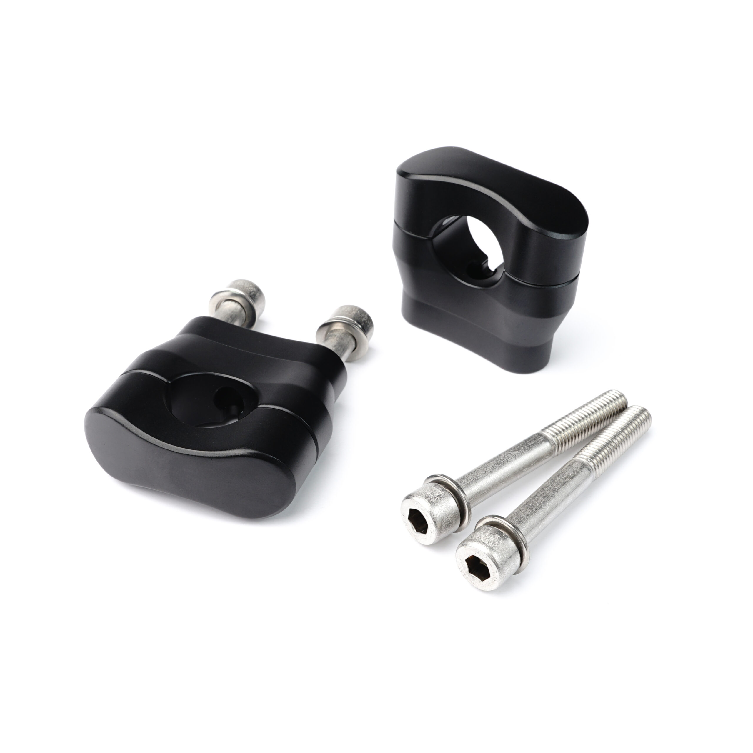 The risers are mounted to the triple tree using four M8 stainless steel bolts, which are included. They can be used with our own Rebelmoto Triple Tree Clamps, and any other triple tree with 8mm mounting holes. The risers can also be used with the BMW 4mm OEM steel yoke. This requires shorter M8 bolts, than the ones included.